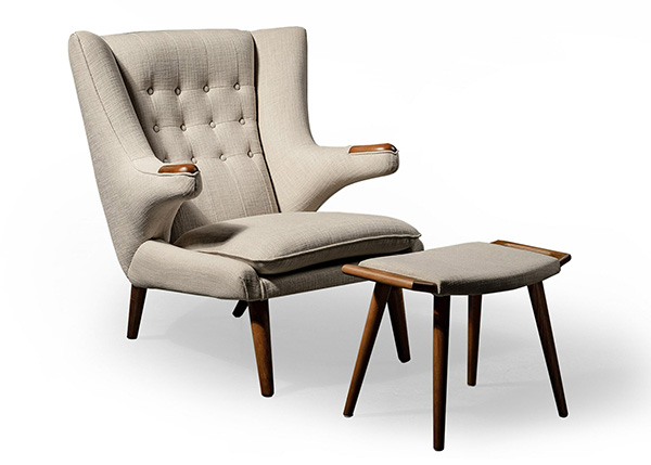 This uniquely Danish high wing-back chair is absolutely Mid Century Modern in design. Created in 1951, it has become the most sought after Hans J. Wegner upholstered chair. Initially called the “AP-19” It quickly received its lasting name, Papa Bear & Teddy Bear Chair. This gift came from a critic who referred to its armrests as, “Great bear paws embracing you from behind.”