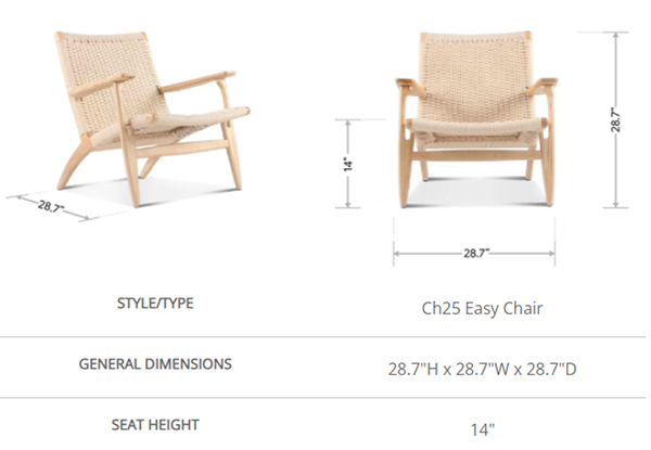 The CH25 Easy Chair was one of the first chairs inspired by modern Danish design and has sustained popularity for its ease of comfort and adaptability as a simple lounge chair. It was a revolutionary contribution to structural design for its use of woven paper cord as a substitution material during the Second World War. It takes a skilled craftsman 10 hours to hand weave this pattern for the unique seat and back, resulting in an incredible lounge chair with the timeless warmth of wicker and wood. Relaxed and intuitively ergonomic, the Easy Chair can blend with modern or traditional interiors in nearly any room in the house. Though it has a low seat and reclining back, the broad armrests make getting out this chair easy.