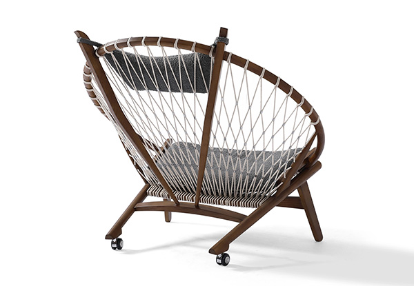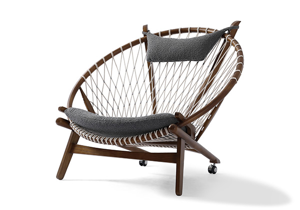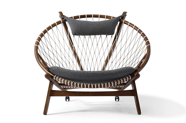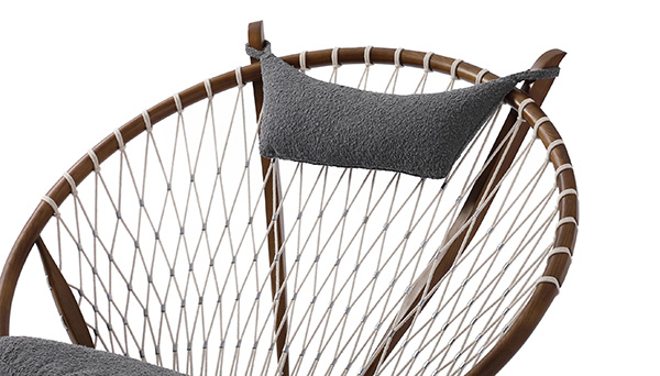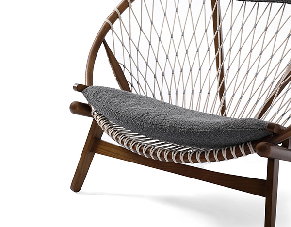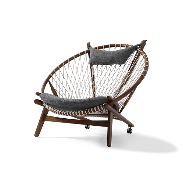 Surprising comfort is derived from a generously padded, concave cushion that is suspended over the rope weave. A small pillow suspends from the two beams supporting the head. The frame is crafted from solid wood; we love the durable organic appeal. The Hans Wegner Hoop Chair contributes real-world functionality, architecture & historic modernism no matter which room it ends up in tomorrow.