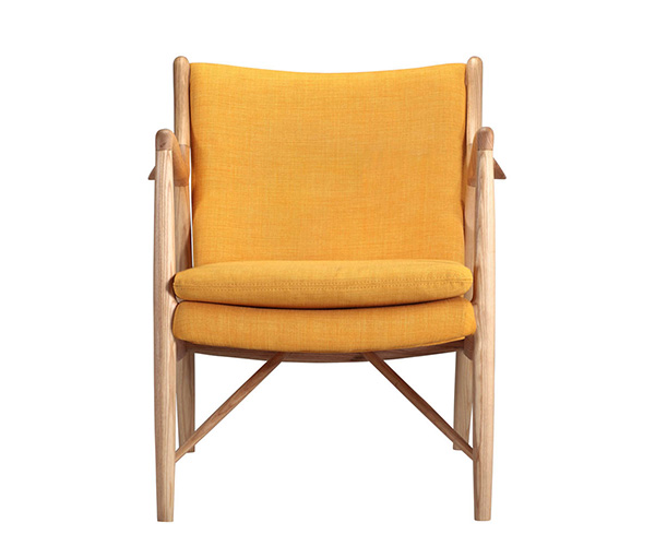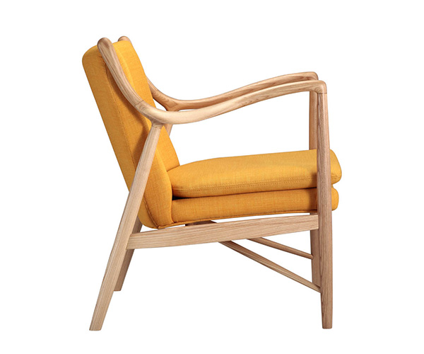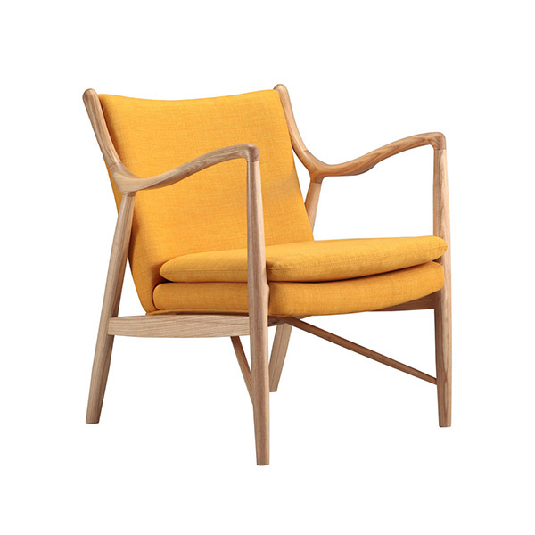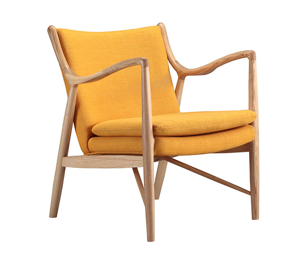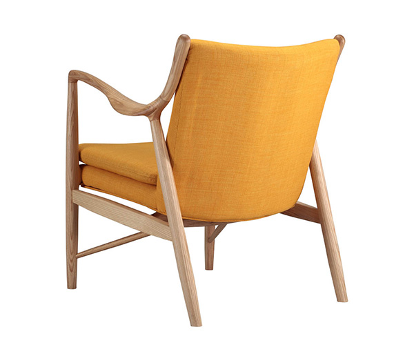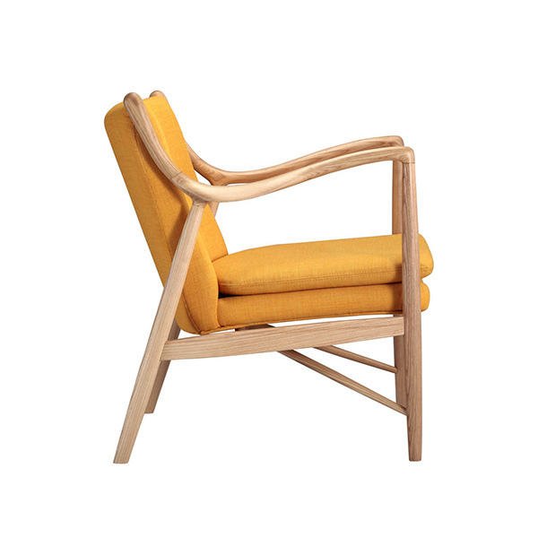The year was 1945, and Finn Juhl had just released the original model 45 chair. The 45 was a break from the traditional armchair in that the seat and back were freed by design from the frame of the chair. A floating visual from all angles and an architecturally intriguing frame were the bi-products of this newly found freedom. Like the original, this exceptional reproduction features a solid timber American Walnut frame. Finn achieved the drawn-out windswept appearance by drawing the arms upward and forward while the mid seat frame section draws down and toward the back. Comfort is achieved through the foam wrapped and upholstered foam frame and plush multi-density seat cushion.