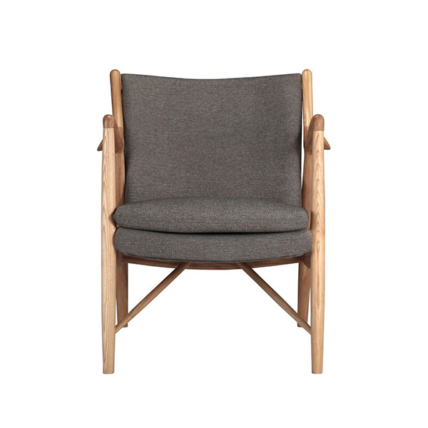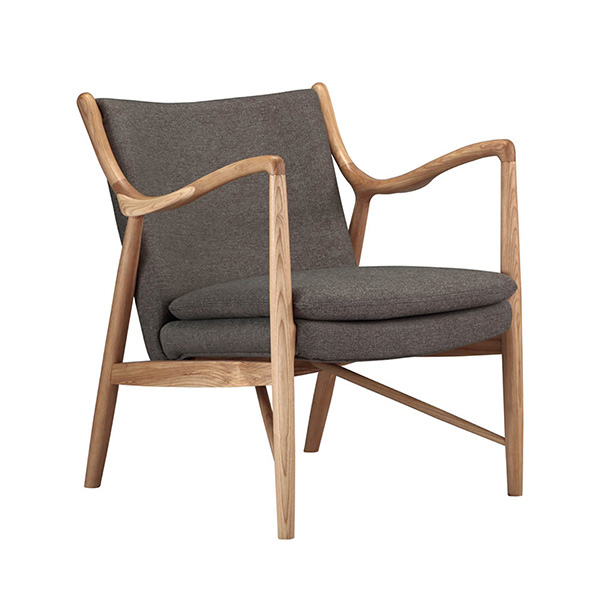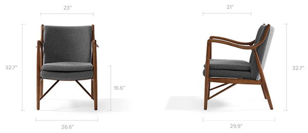 The year was 1945, and Finn Juhl had just released the original model 45 chair. The 45 was a break from the traditional armchair in that the seat and back were freed by design from the frame of the chair. A floating visual from all angles and an architecturally intriguing frame were the bi-products of this newly found freedom. Like the original, this exceptional reproduction features a solid timber American Walnut frame. Finn achieved the drawn-out windswept appearance by drawing the arms upward and forward while the mid seat frame section draws down and toward the back. Comfort is achieved through the foam wrapped and upholstered foam frame and plush multi-density seat cushion.