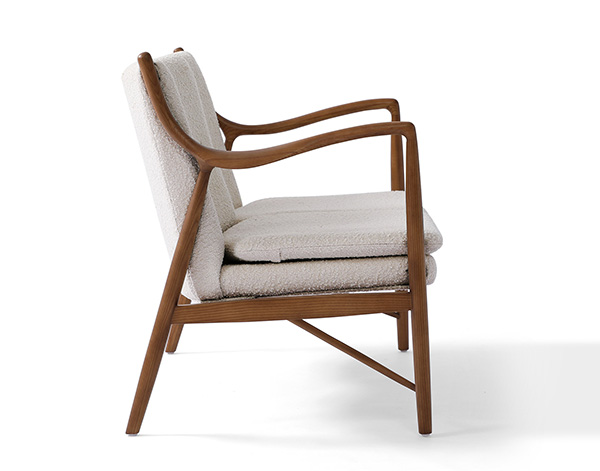 The year was 1945 and Finn Juhl had just released the original model 45 chair. The 45 was a break from the traditional armchair in that the seat and back were freed by design from the frame of the chair. A floating visual from all angles and an architecturally intriguing frame were the bi-products of this newly found freedom. Like the original, this exceptional reproduction features a solid timber American Walnut frame. Finn achieved the drawn-out windswept appearance by drawing the arms upward and forward while the mid seat frame section draws down and toward the back. Comfort is achieved through the foam wrapped and upholstered foam frame and plush multi-density seat cushion.