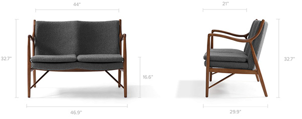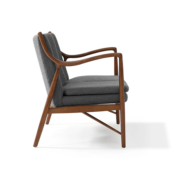 The year was 1945 and Finn Juhl had just released the original model 45 chair. The 45 was a break from the traditional armchair in that the seat and back were freed by design from the frame of the chair. A floating visual from all angles and an architecturally intriguing frame were the bi-products of this newly found freedom. Like the original, this exceptional reproduction features a solid timber American Walnut frame. Finn achieved the drawn-out windswept appearance by drawing the arms upward and forward while the mid seat frame section draws down and toward the back. Comfort is achieved through the foam wrapped and upholstered foam frame and plush multi-density seat cushion.