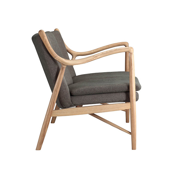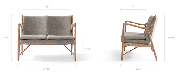 The year was 1945 and Finn Juhl had just released the original model 45 chair. The 45 was a break from the traditional armchair in that the seat and back were freed by design from the frame of the chair. A floating visual from all angles and an architecturally intriguing frame were the bi-products of this newly found freedom. Like the original, this exceptional reproduction features a solid timber American Walnut frame. Finn achieved the drawn-out windswept appearance by drawing the arms upward and forward while the mid seat frame section draws down and toward the back. Comfort is achieved through the foam wrapped and upholstered foam frame and plush multi-density seat cushion.