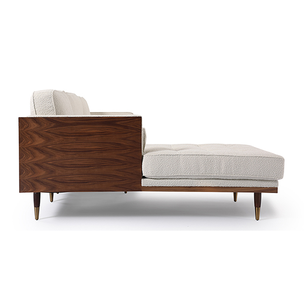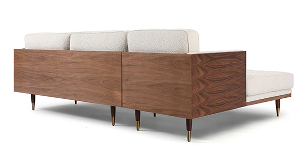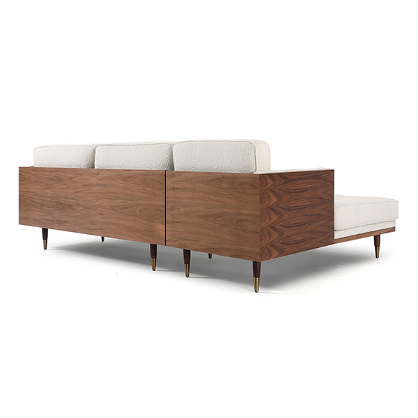 This elevated chaise sectional is meant for feet up, laid back lounging. Skandi is our contemporary, comfortable, American Walnut sofa. Feels like we’re introducing tomorrow's classic. We love napping on the cylindrical side pillows and we can vouch for the comfort. It's something we’ve engineered into the generous full width seat cushion and supporting spring system.