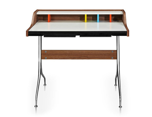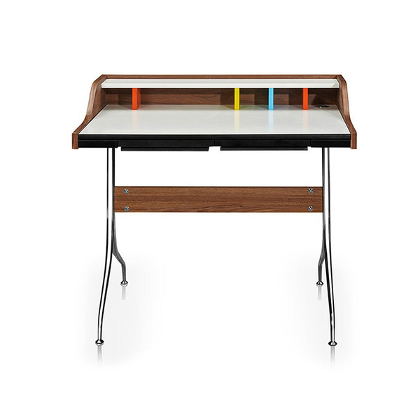 This was long before laptops, tablets, and smartphones. What he did not realize at the time is that this small desk makes exceptional use of space and compliments these small scale electronics perfectly. Used both office and home settings, the Swag Desk fits exceptionally well into tight spaces. The white Melamine laminate desk surface provides a clean sharp work surface, a defining contrast to the dark walnut and a neutral canvas from which Chartreuse, Spa Blue, and Orange dividers pop forward.